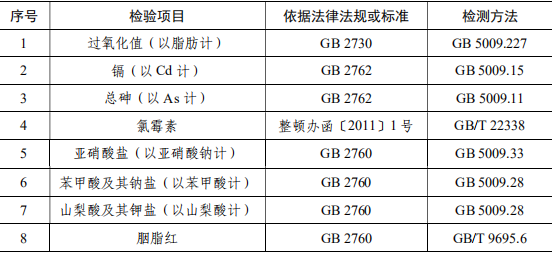 GB 2730 食品安全國家標準 腌臘肉制品 GB 2760 食品安全國家標準 食品添加劑使用標準 GB 2762 食品安全國家標準 食品中污染物限量 GB 5009.11 食品安全國家標準 食品中總砷及無機砷的測定 GB 5009.12 食品安全國家標準 食品中鉛的測定 GB 5009.15 食品安全國家標準 食品中鎘的測定 GB 5009.28 食品安全國家標準 食品中苯甲酸、山梨酸和糖精鈉的測定 GB 5009.33 食品安全國家標準 食品中亞硝酸鹽與硝酸鹽的測定 GB 5009.227 食品安全國家標準 食品中過氧化值的測定 GB/T 9695.6 肉制品 胭脂紅著色劑測定 GB/T 22338 動物源性食品中氯霉素類藥物殘留量測定
