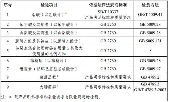 GB 2760 食品安全國家標準 食品添加劑使用標準 GB 4789.2 食品安全國家標準 食品微生物學檢驗 菌落總數測定 GB 4789.3 食品安全國家標準 食品微生物學檢驗 大腸菌群計數 GB/T 4789.3-2003 食品衛生微生物學檢驗 大腸菌群測定 GB 5009.28 食品安全國家標準 食品中苯甲酸、山梨酸和糖精鈉的測定 GB/T 5009.41 食醋衛生標準的分析方法 GB 5009.97 食品安全國家標準 食品中環己基氨基磺酸鈉的測定